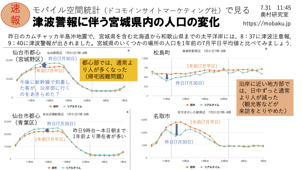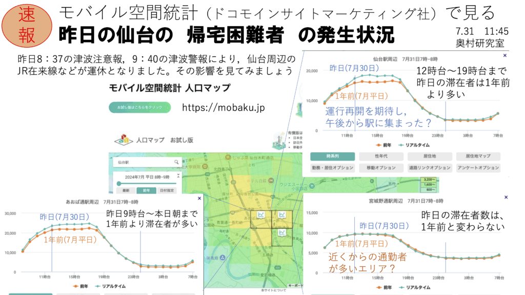 ドコモインサイトマーケティング社がホームページ上で公開しているモバイル空間統計の人口マップのデータを用いて,昨年同時期との人口の時間的変化を比較しました。報告のポスターを,現在開催中のオープンキャンパス会場にも掲示しました。